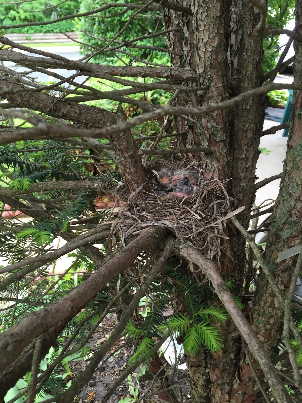 Hope each one of you is enjoying a good weekend. Today I have two photos of baby robins to share. Same robins, different camera position. Hard to get too close because one of the parents hovers overhead and squawks. It's spring here, and young life is delightful to observe when one is lucky enough to have a good view.